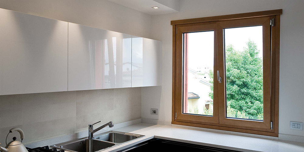 Gli interni open space del soggiorno legano con armonia ed eleganza insieme ai colori naturali del legno di queste finestre.